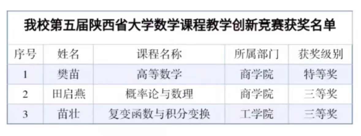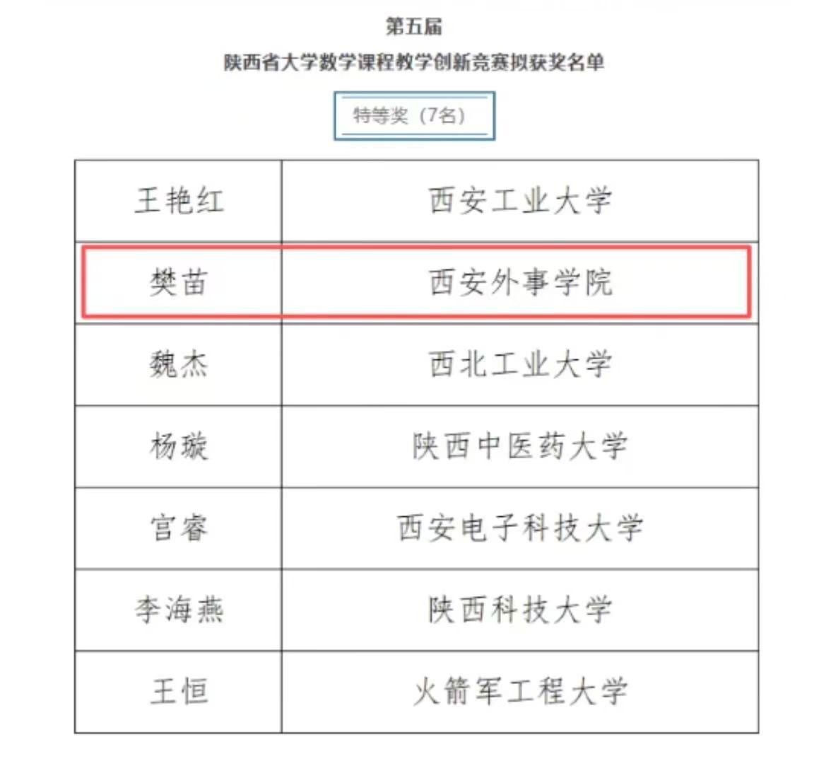近日,由陕西省教科文卫体工会委员会与陕西省数学会联合主办的第五届陕西省大学数学课程教学创新竞赛获奖结果正式公示。西安外事学院共有8位教师参与比赛,其中商学院樊苗荣获特等奖,商学院田启燕、工学院苗壮荣获三等奖。